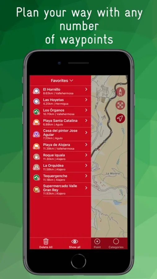An integrated database allows you to search for POIs as well as a large number of streets, towns, villages, districts, etc. The search can be filtered by category and/or distance.