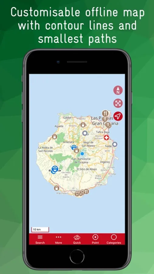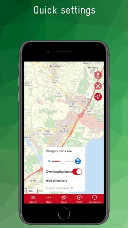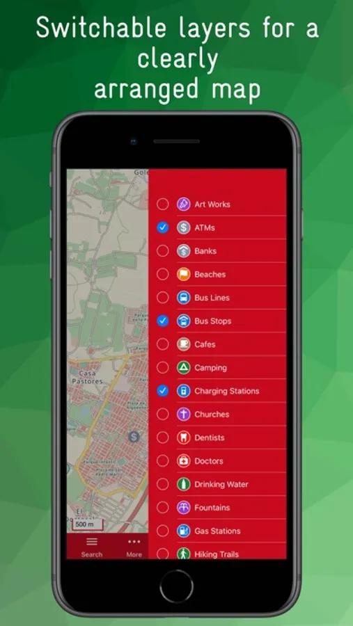 POIs are grouped into categories and can be displayed as layers. For example, you can display all restaurants, public transport lines, banks, hiking trails, charging stations and doctors on the map. The size and overlap of the icons can be adjusted to improve clarity.