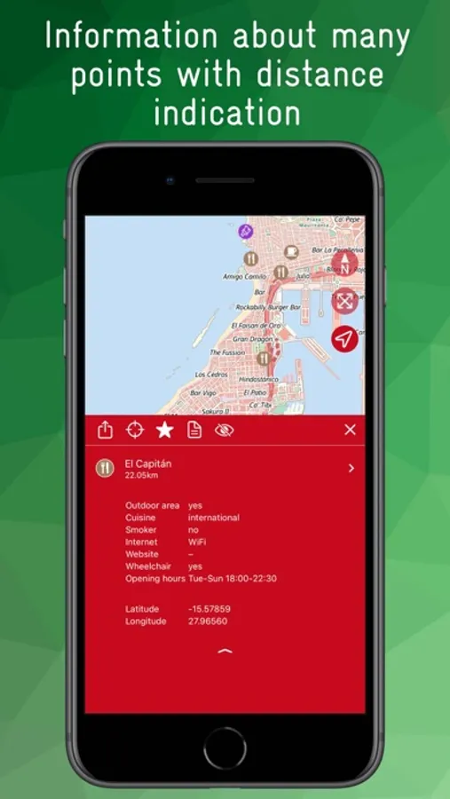 For many POIs there is further information such as opening hours, address, disabled access, ... Notes or favourites can be created for each POI, a history list shows the most recently used POIs, content can be shared.