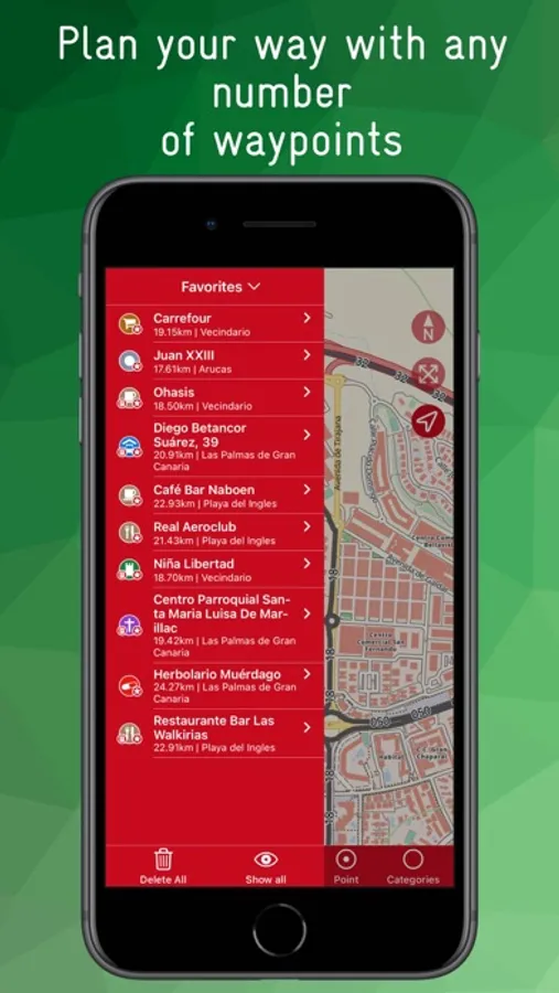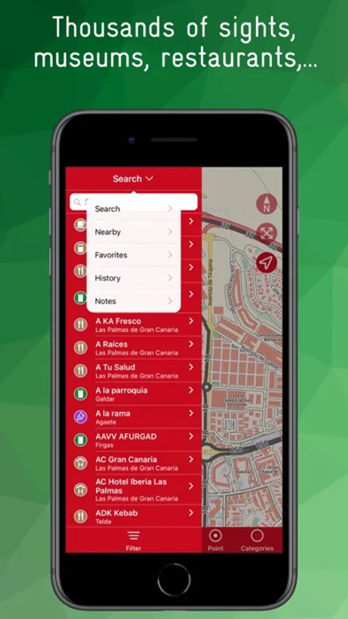 An integrated database allows you to search for POIs as well as a large number of streets, towns, villages, districts, etc. The search can be filtered by category and/or distance.