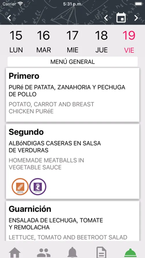 Nuestra app informa a los padres y tutores de los menús diarios de cada uno de los alumnos asignados, ofreciendo información de alérgenos, valor nutricional y sugerencias para la cena en cada uno de los días en que el alumno asiste al comedor. Además informa del comportamiento del alumno así de cómo ha comido el propio alumno.