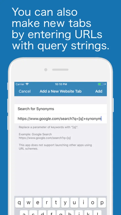 Just enter a word or phrase and tap the “Search” button — it instantly looks it up across your favorite websites. The app performs a cross-site search using all the websites you’ve added to the tab bar, so you can easily compare results side by side.