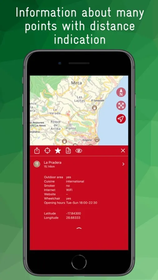 For many POIs there is further information such as opening hours, address, disabled access, ... Notes or favourites can be created for each POI, a history list shows the most recently used POIs, content can be shared.