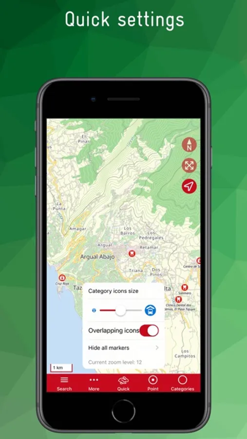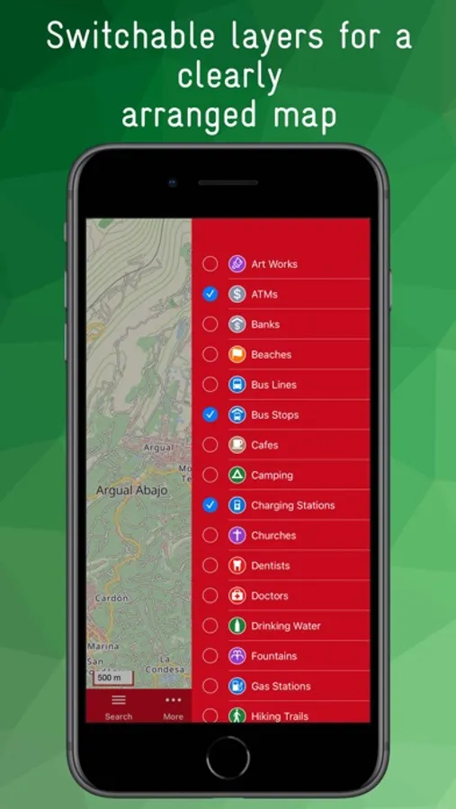 POIs are grouped into categories and can be displayed as layers. For example, you can display all restaurants, public transport lines, banks, hiking trails, charging stations and doctors on the map. The size and overlap of the icons can be adjusted to improve clarity.