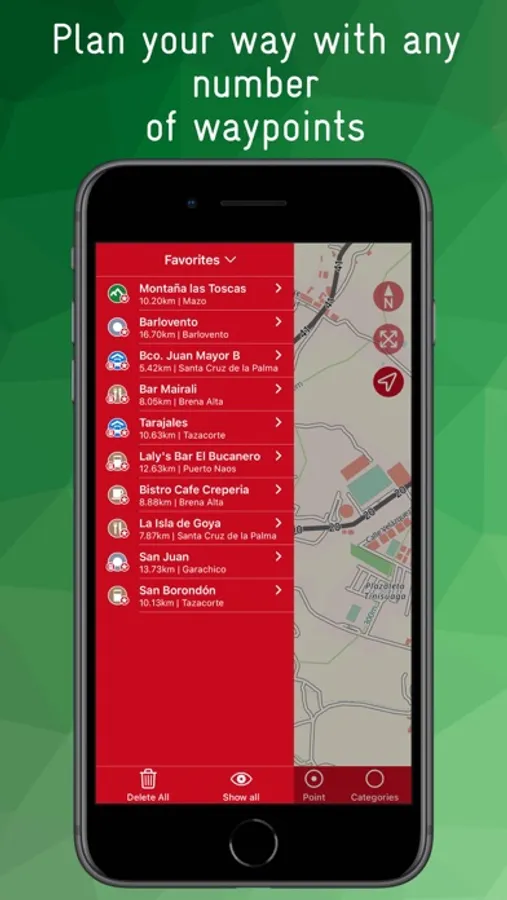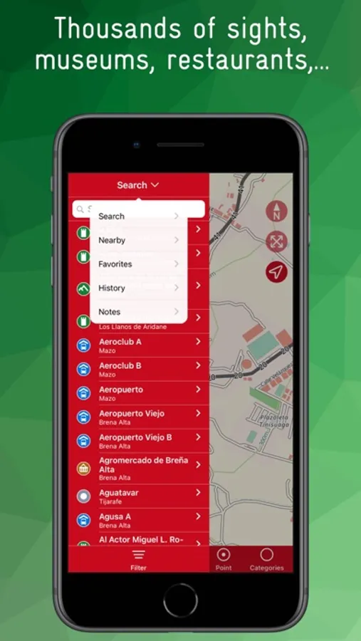 An integrated database allows you to search for POIs as well as a large number of streets, towns, villages, districts, etc. The search can be filtered by category and/or distance.