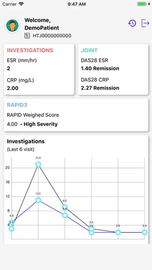 MyRA Touch is useful among medical practitioners who manage RA patients. This program is available in four languages, ie English, Malay, Mandarin, and Tamil. There is also an animation version with voice recording in 4 languages for illiterate patient. RA patients will enter the necessary data required for disease activity assessment prior to each clinic visit. For example, number of tender and swollen joints based on 28 joints disease activity scoring index (DAS-28). Other parameters being recorded in this application include: number of self-reported tender and swollen joints based on DAS28 via visual joint homunculus, Routine Assessment of Patient Index Data 3 (RAPID3), and Global Health Assessment using 100mm visual analogue scale (VAS). Patients are required to complete all data entry before assessment can be made. Patient’s RA disease activity will be auto-calculated by this electronic application. Current and previous disease activities score index will be displayed on a separate summarized page.