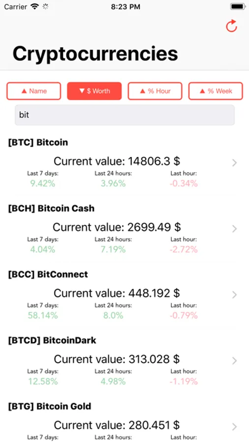 View and analyze worth of 100 cryptocurrencies. Check growth of your favorite cryptocurrency in a hour / day or week time period. See beautiful charts and make your decision about investing in cryptocurrencies! Be on time with all of the worth changes in your favorites cryptocurrencies!