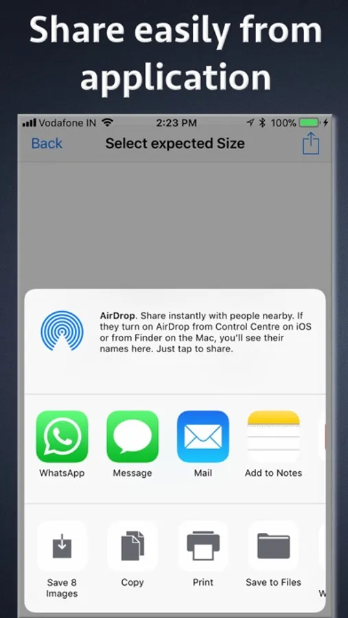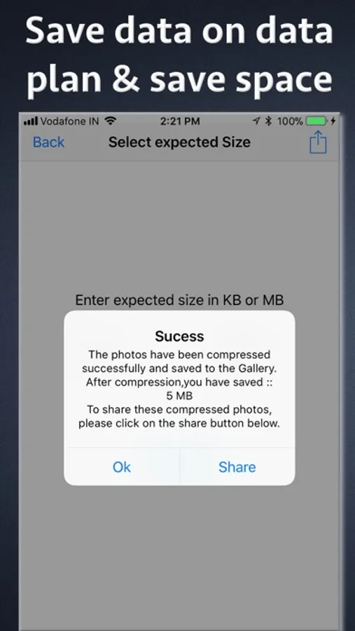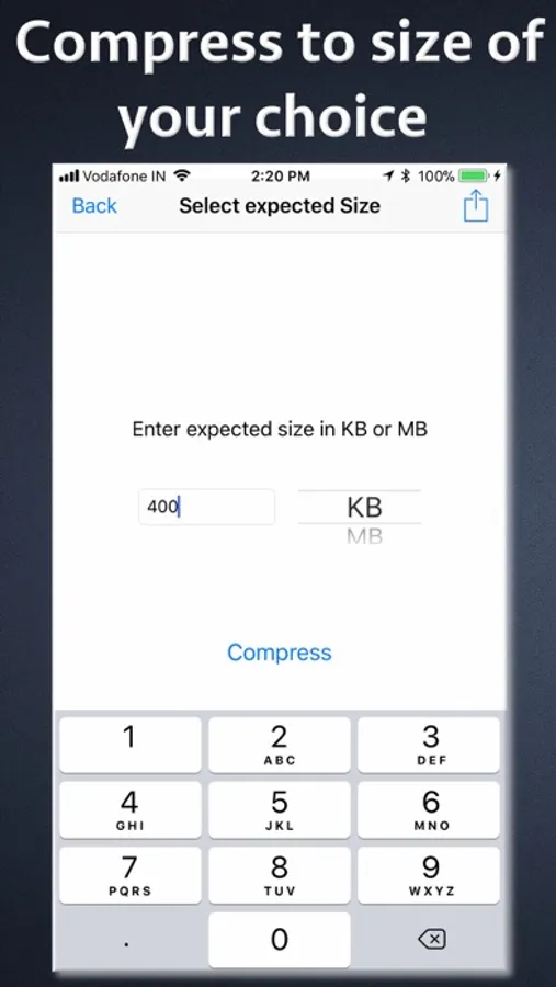 -- The application supports defining an exact size to be achieved using compression.Using this feature, one could specify that what is the exact size he is expecting from the photos after compression.