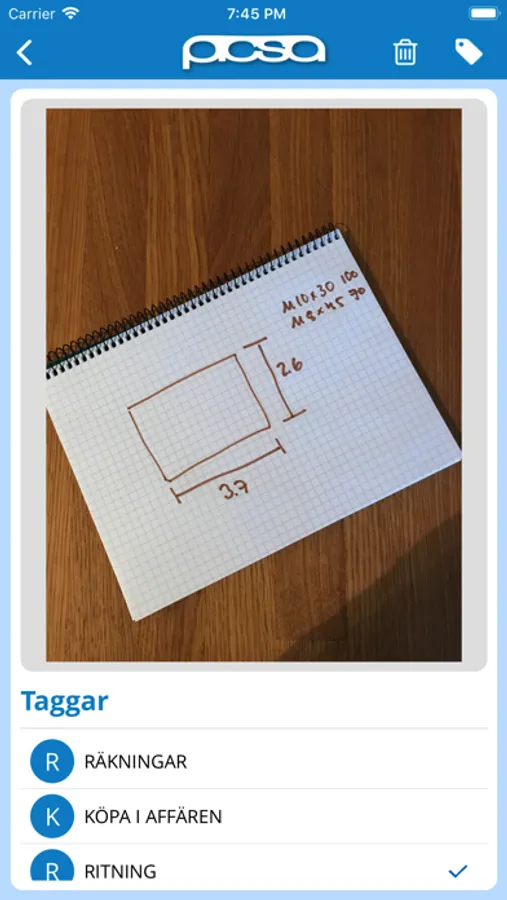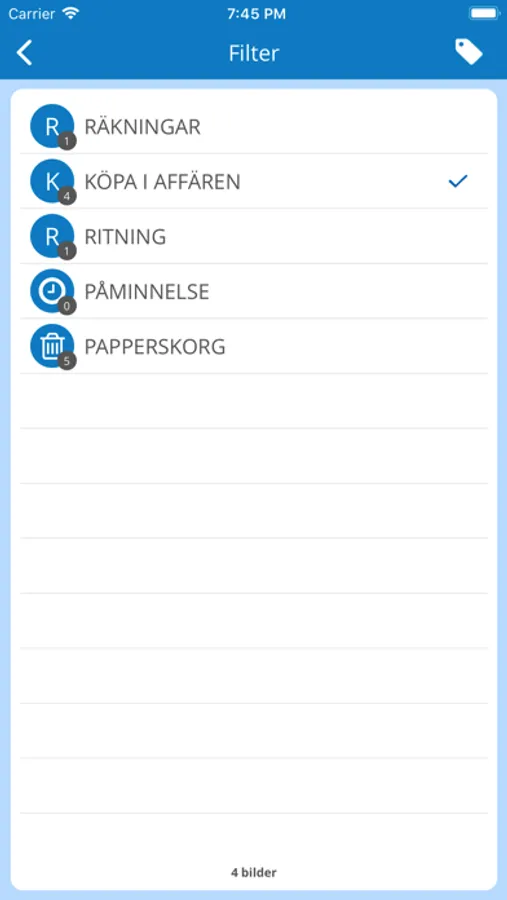 - Kategorisera dina bilder genom att märka dem med taggar, t.ex: KÖPA, ELDA UPP, ICA osv.. Du kan skapa hur många taggar du känner för!