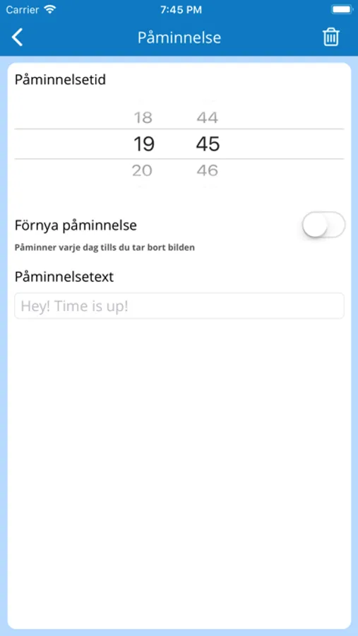 - Påminnelse! Ställ in vilken tid du vill bli påmind. En gång eller upprepande!