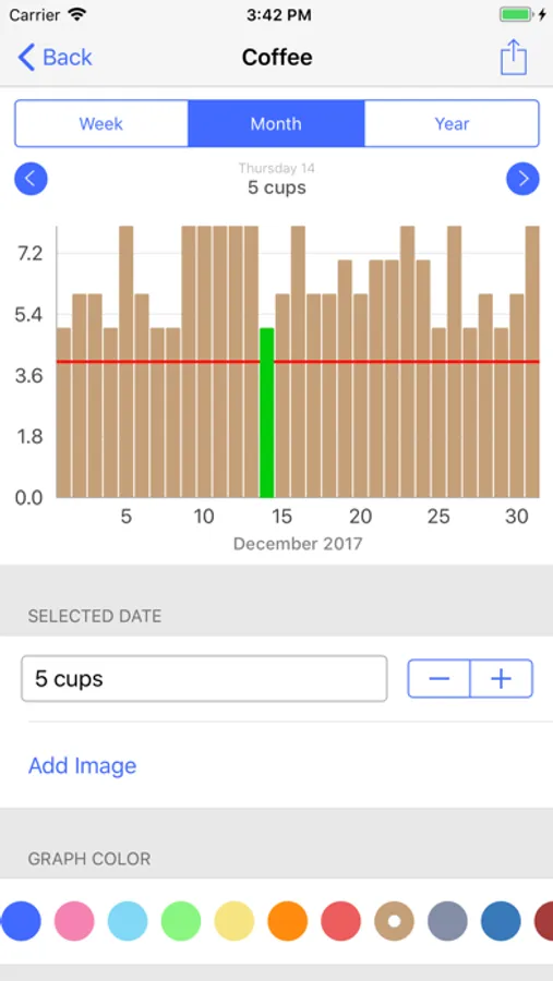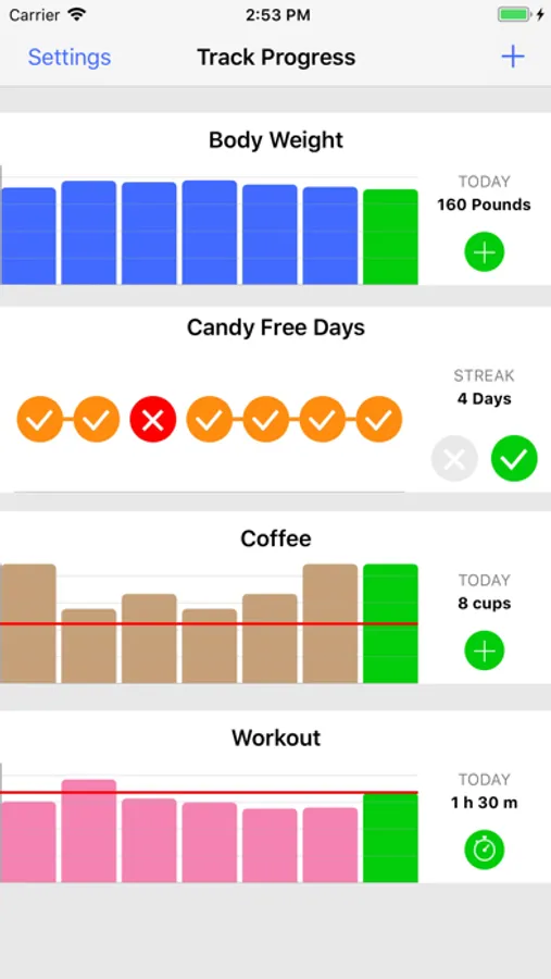Keep track of your progress, wether you want to reduce your caffeine or calorie intake, eat less cookies, or record how much you've worked out or lost weight. You decide!