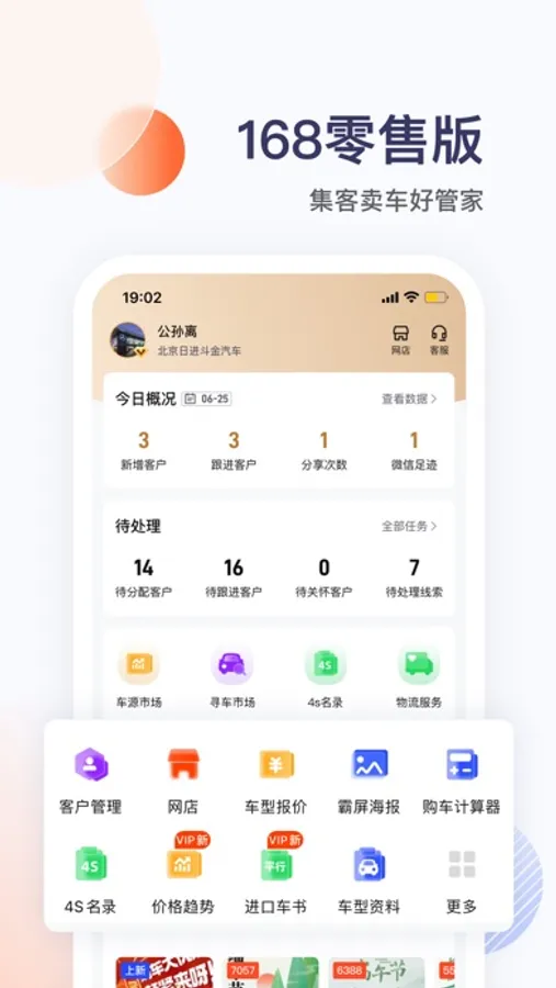 卖车管家是大搜车旗下 车行168 开发的一款营销管理工具,主要面向大型和中小型综合汽贸,为其提供找车、物流、垫款、营销集客以及汽车销售管理等一整套服务,带领综合汽贸轻松进入汽车“新零售”时代