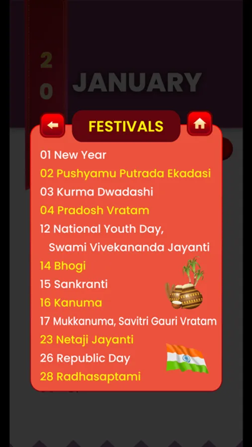 Calendar 2023 in English gives all the important information about Indian panchangam, hindi panchangam, Upavasam(Pasting) dates, Muhurat 2023: all important muhurats like naming Govt holidays, ceremony dates, marriage Muhurat / Vivah muhurat, vehicle purchase, property purchase, gruha pravesh dates for the new year 2023 available in this Calendar 2023 app.
