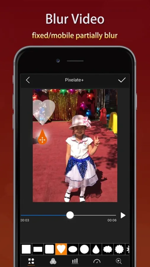 + Mosaic a part of the video statically or dynamically: select the shape and type, adjust the blur intensity and speed of moving, drag the handler and move to blur the selected part of the video; can invert the blurred area