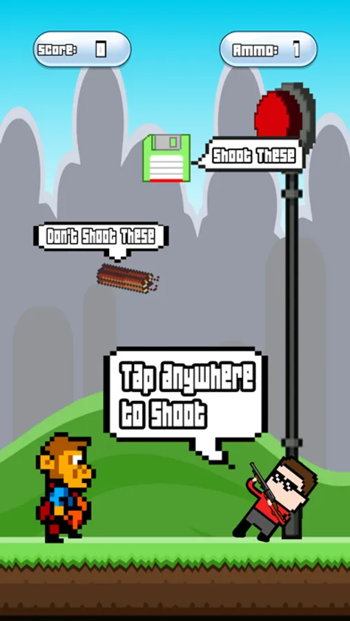 The most difficult phone game you will ever play. Shoot the floppy disks out of the air. Don't let them hit the button.