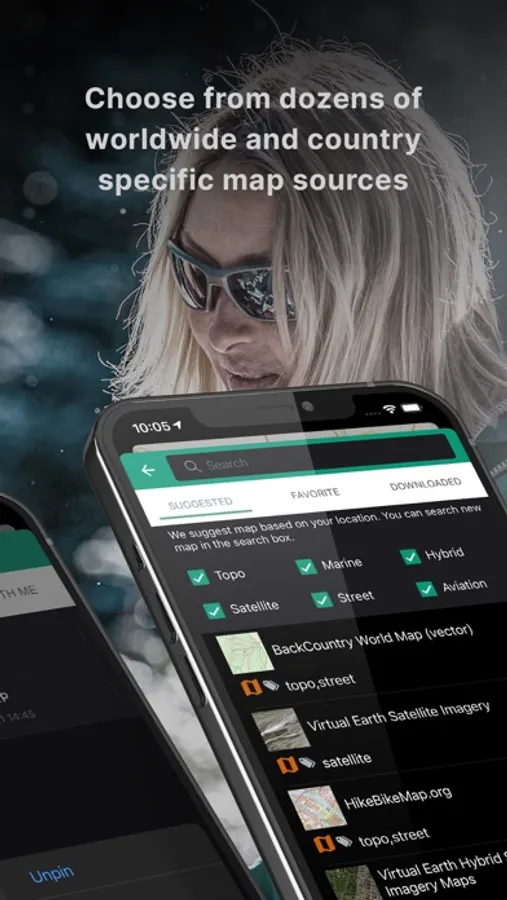 Choose from over 50 worldwide and country specific map sources. App makes suggestions based on where the map is centered. The worldwide sources are often the best. Some countries with specific content to consider are Spain, UK, Australia, New Zealand, and Canada.