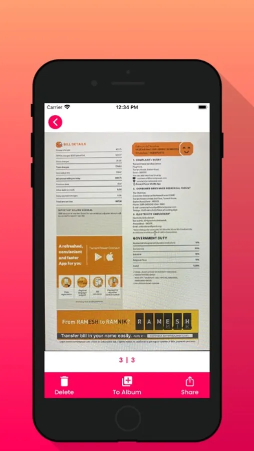 - Email or share documents as PDF, save to album and delete single/multiple pages.