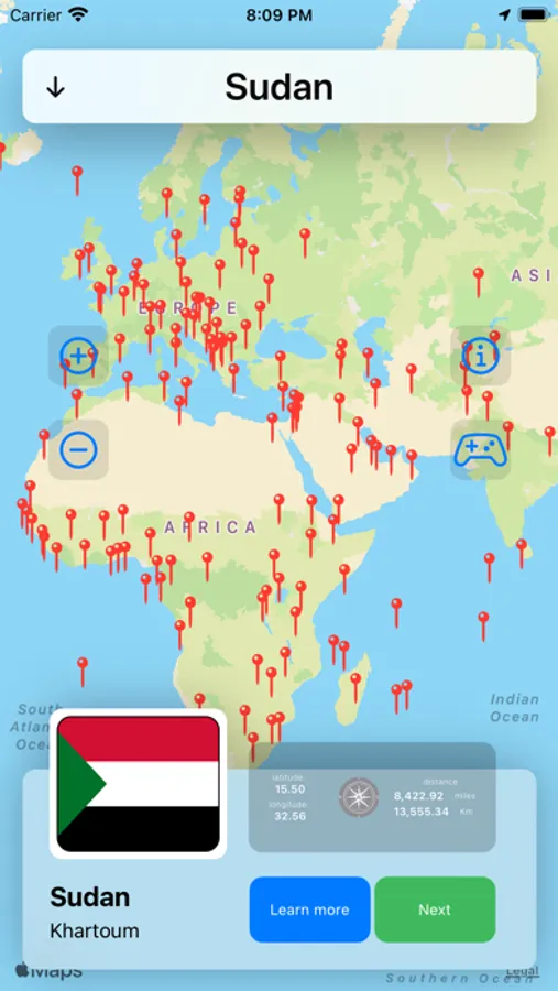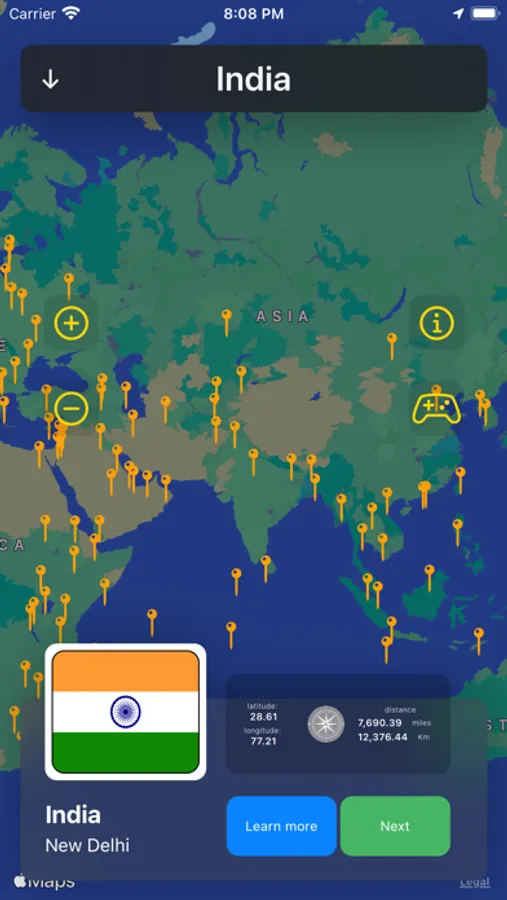 - click on each pin and get the distance in miles and kilometers between you and the selected capital;