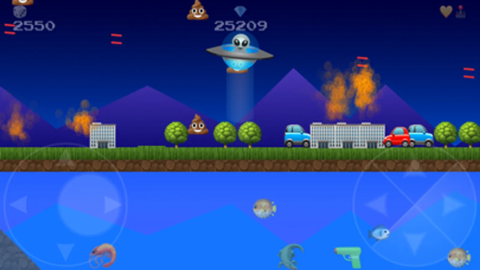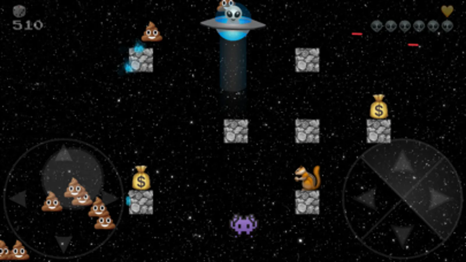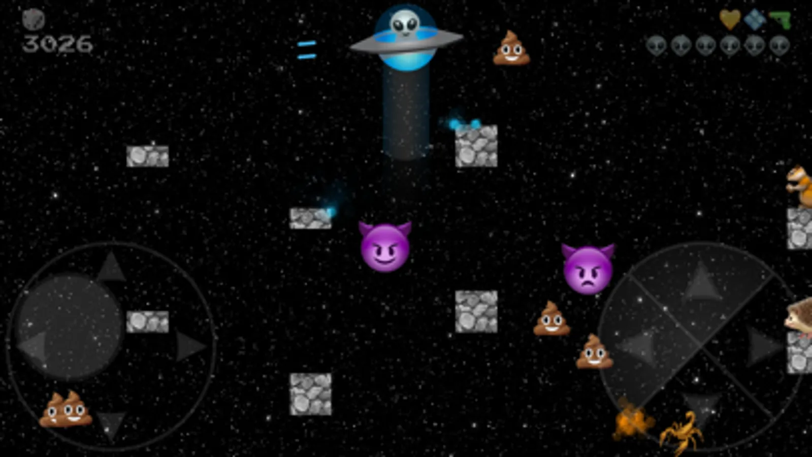 UFO Emoji is an arcade style side scrolling video game that is easy and fun to play. Beware it might also be a little addictive. You get to choose between 3 different characters and space craft. The game offers a variety of different levels with a least three themes. As a pilot of an alien space craft, you'll soon discover what it takes to finesse your way between small spaces. Hidden in each level are a variety of power ups that will help you blast you way to your high score. Have fun and we hope you enjoy UFO Emoji!