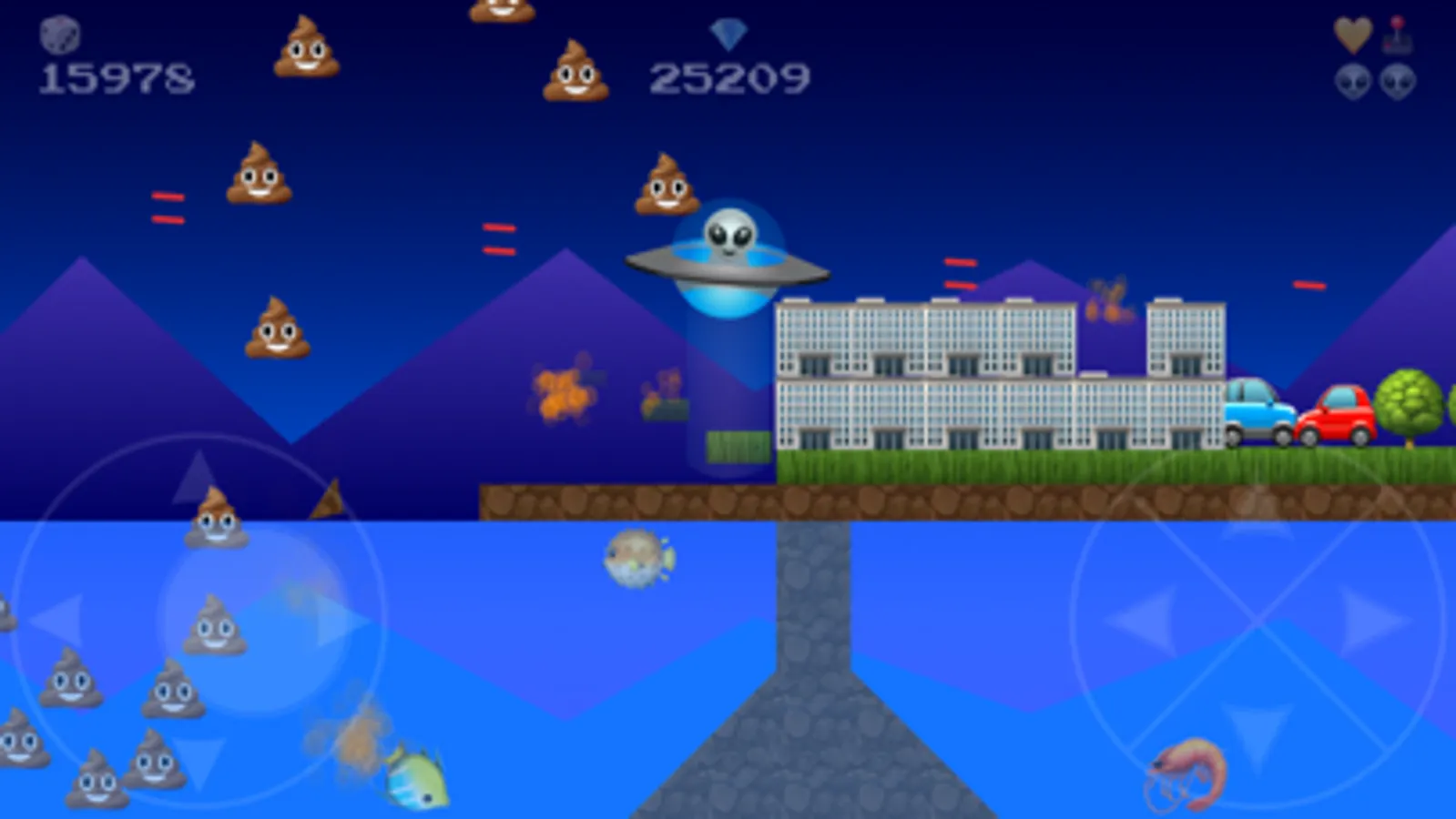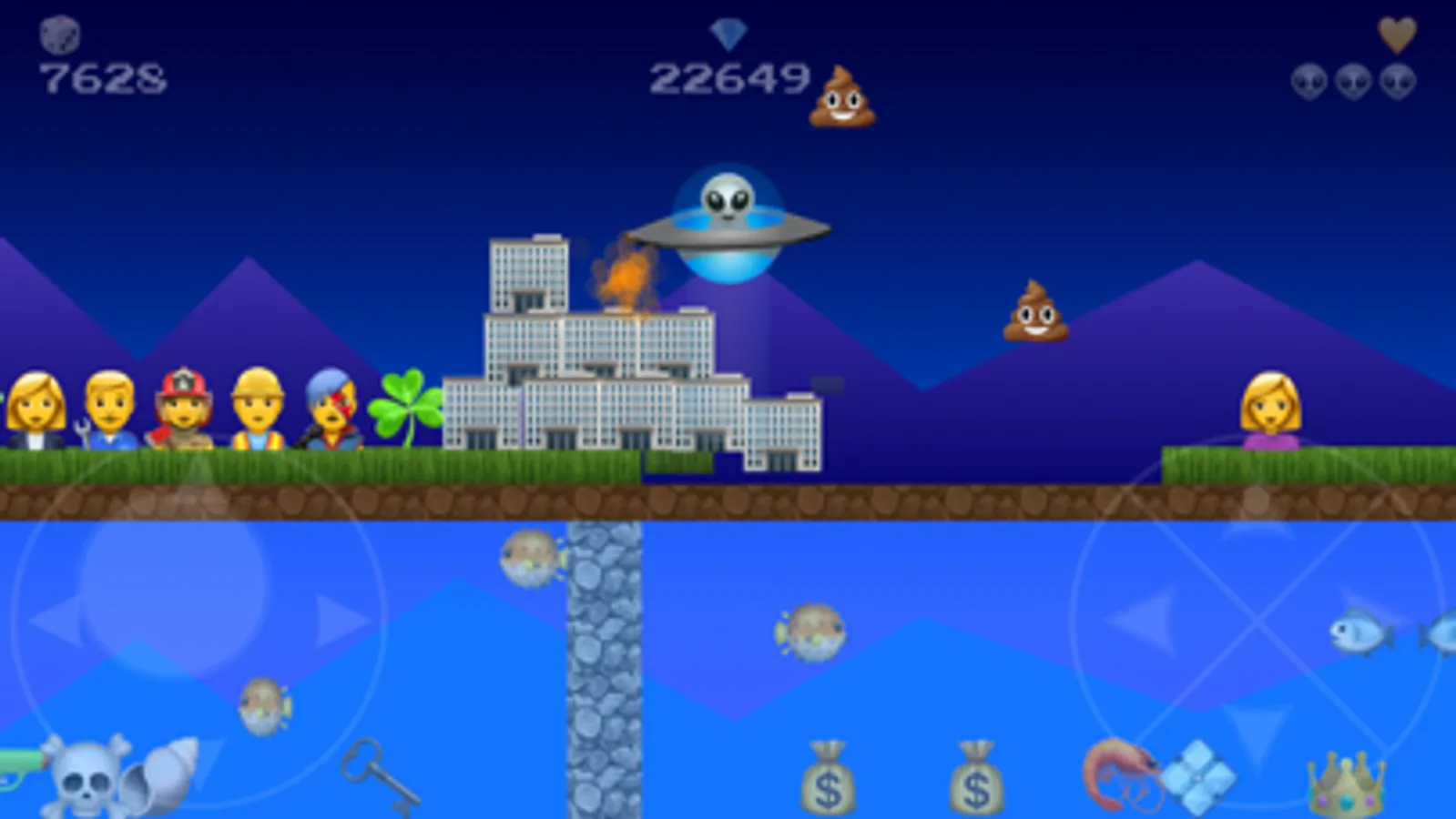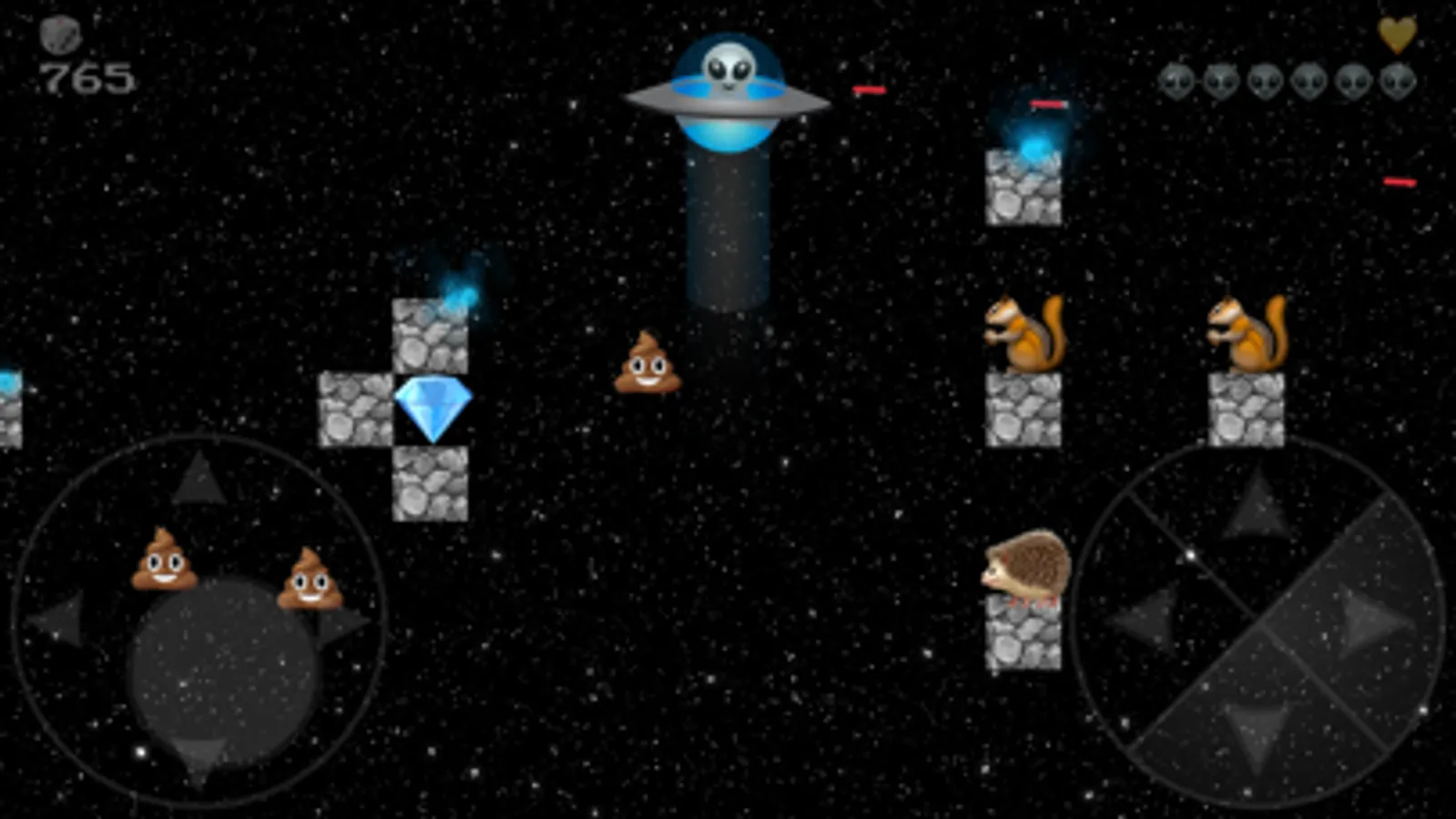 UFO Emoji is an arcade style side scrolling video game that is easy and fun to play. Beware it might also be a little addictive. You get to choose between 3 different characters and space craft. The game offers a variety of different levels with a least three themes. As a pilot of an alien space craft, you'll soon discover what it takes to finesse your way between small spaces. Hidden in each level are a variety of power ups that will help you blast you way to your high score. Have fun and we hope you enjoy UFO Emoji!
