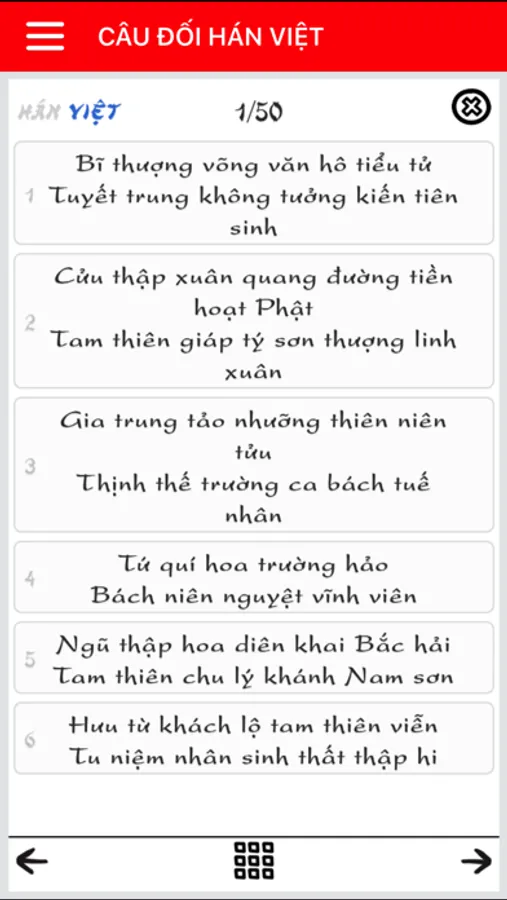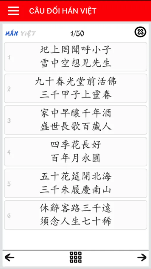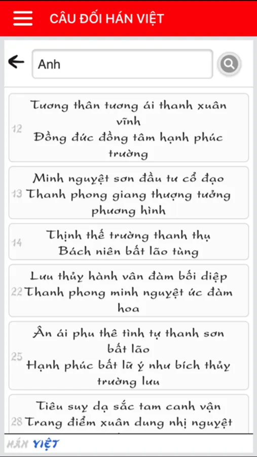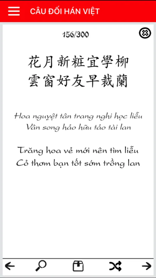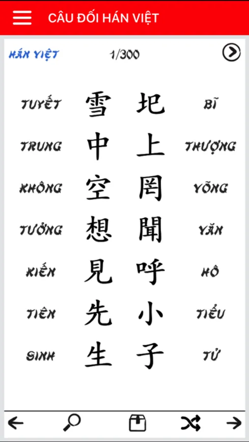 Tuyển tập Câu Đối Hán Ngữ với hơn 300 câu đối, hoành phi với chữ Hán, phiên âm, dịch nghĩa, dịch thơ và từ điển Hán Việt đi kèm chữ theo phiên âm Hán Việt sẽ giúp bạn trở nên thông thạo Chữ Hán hơn. Hiểu những định nghĩa cơ bản của các từ sẽ giúp việc học các ngôn ngữ Tiếng Trung, Tiếng Hàn, Tiếng Nhật trở nên dễ dàng hơn