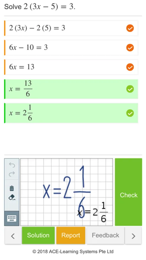 If a grey cross appears, it means the step is incorrect and the student has to check back to correct the working method or step. If an orange tick appears, it shows that it is an intermediate working step. So, the student has to continue to present working steps for checking until he or she obtains a green tick.