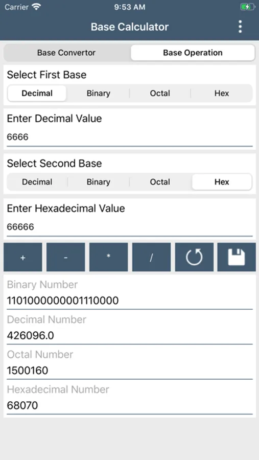 Base Calculator has the facility for mathematical operations like addition, subtraction, multiplication, and division. Here you have to enter two values in any of the bases and then press operation button (+ or - or * or /) you want to perform. It will show results in binary, decimal, octal, and hexadecimal format.
