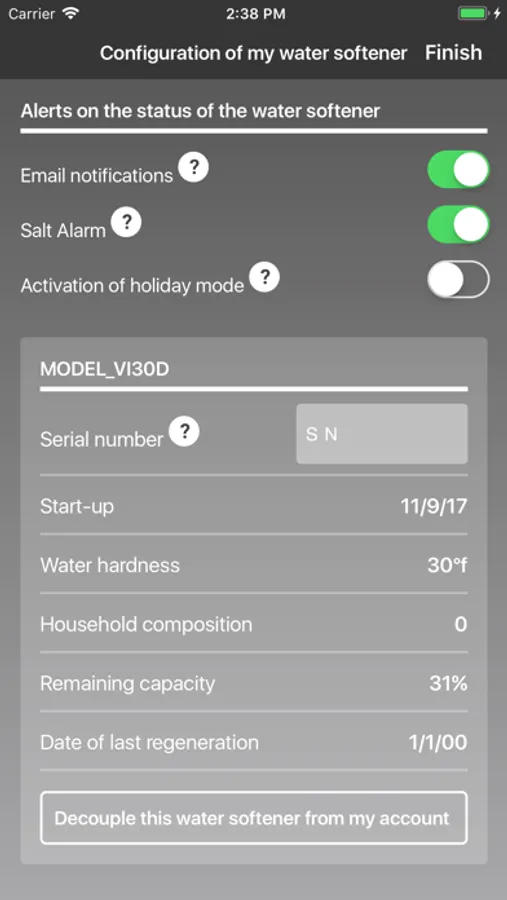 - activate holiday mode; this allows you to stop the softener for a certain period,