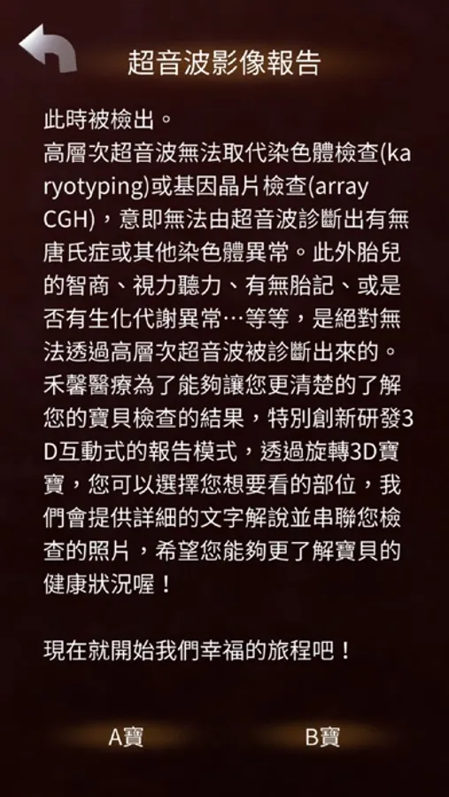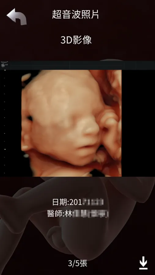 您只要旋轉3D寶寶,點擊該部位上的中文字,就可以看到該部位所拍攝的高層次照片,您也可以再放大照片看得更清楚!另外喜歡的照片也可以透過右下方下載按鈕馬上將照片儲存至您手機的相簿裡,讓您分享喜悅更加快速方便。