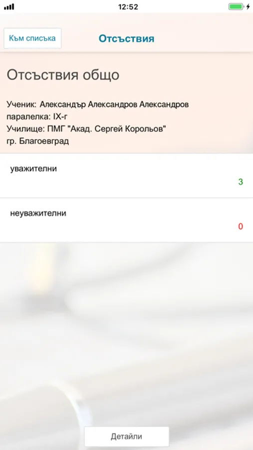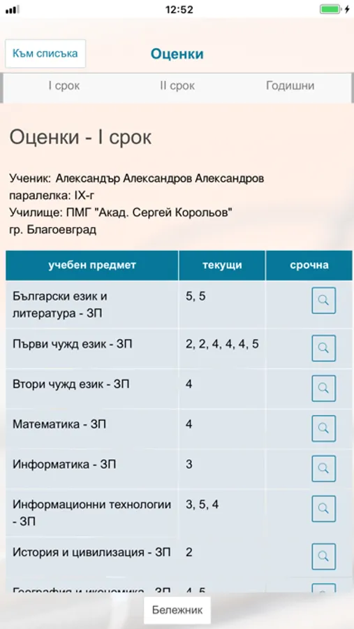 При нови оценки или отсъствия се получава съобщение. Има подробни справки за срок, за година, както и детайлен бележник по дата. Могат да се регистрират няколко ученика по ЕГН.