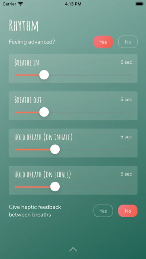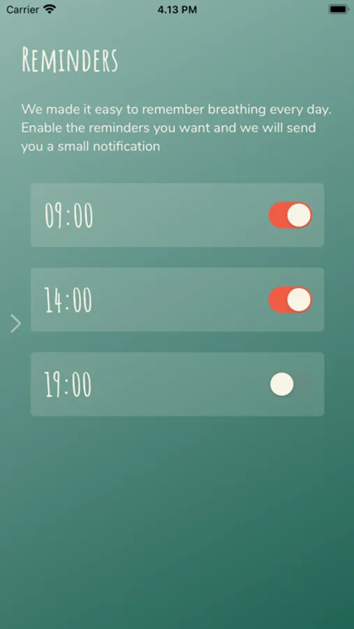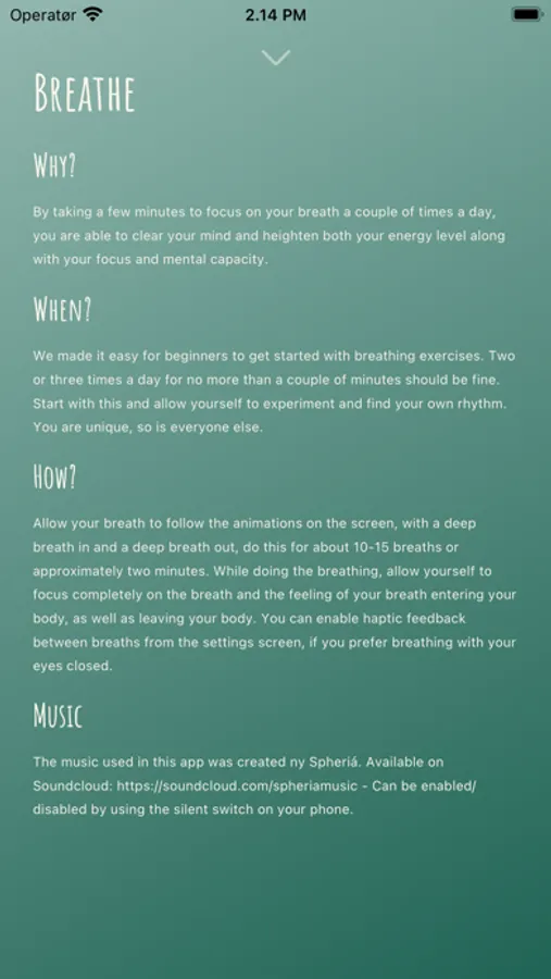 We made it easy for beginners to get started with breathing exercises. All you have to do, is remember to breathe for a few minutes a couple times every day. Two or three times a day for no more than a couple of minutes should be fine. Start with this and allow yourself to experiment and find your own rhythm. You are unique, so is everyone else. To help you remember we included some notifications you can enable be swiping left from the breathing screen.