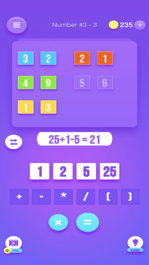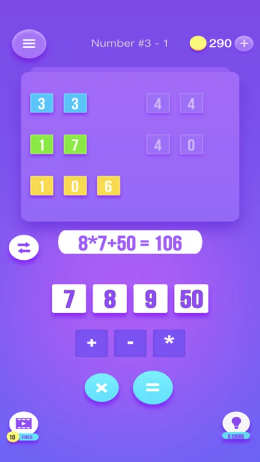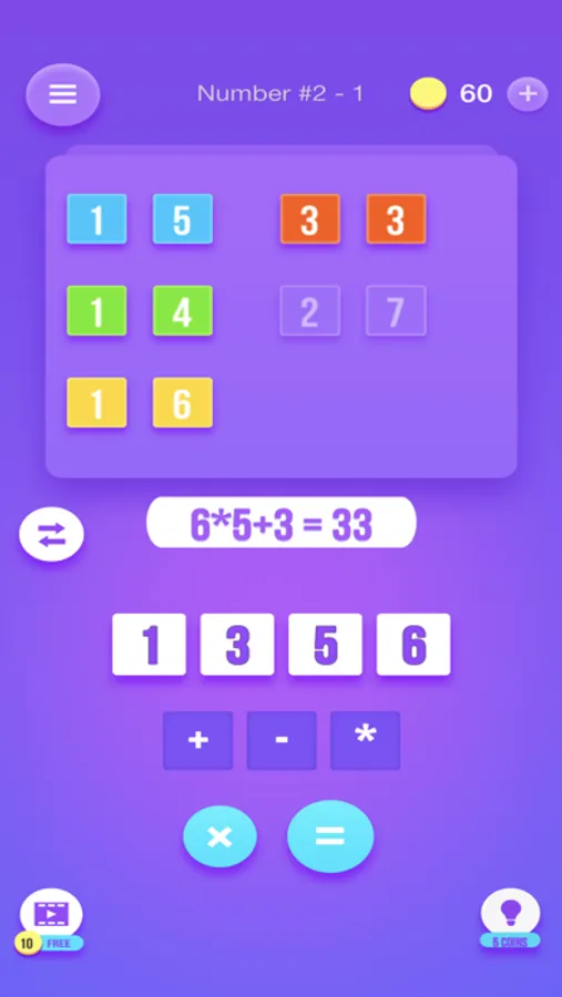 1 - Swipe Mode: Simply connect the numbers and math functions to form the correct equation to achieve the displayed target numbers.