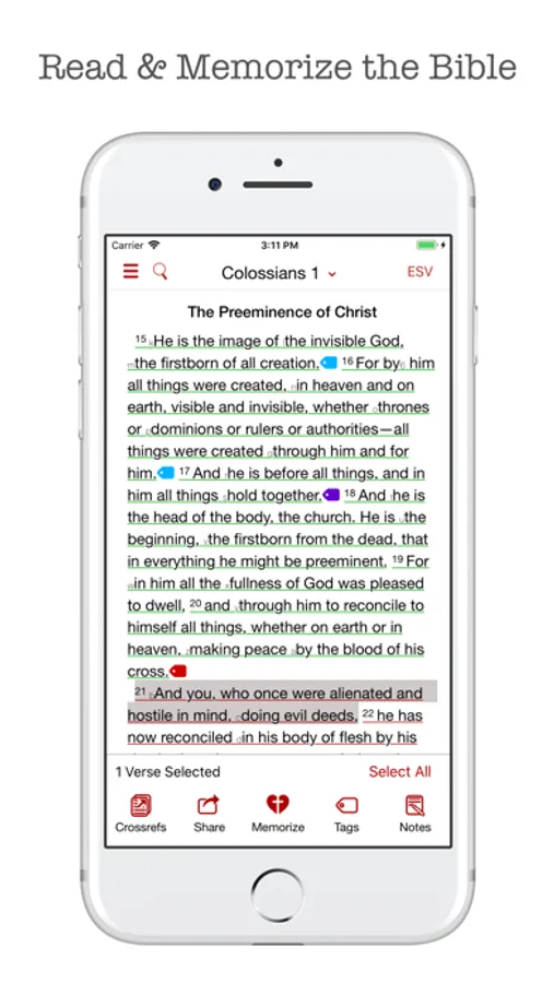• See your memory verses appear underlined in the Bible & color-coded by review status.