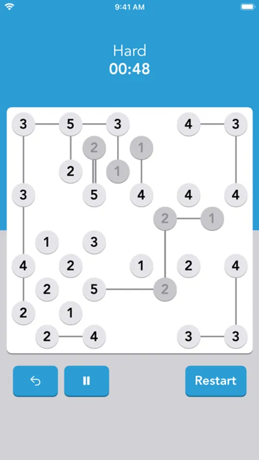 Connect each island by drawing bridges between them. The number of bridges connected to each island must match its number. To finish the game, the islands must be connected in a continuous path, subject to the following constraints:
