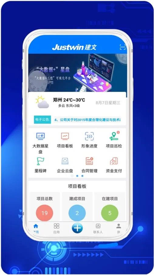 APP主要包括电子公告、形象进度、项目分布、流程监控等等,主要是用来查看项目的进展,项目的审核,以及对项目的监督。
