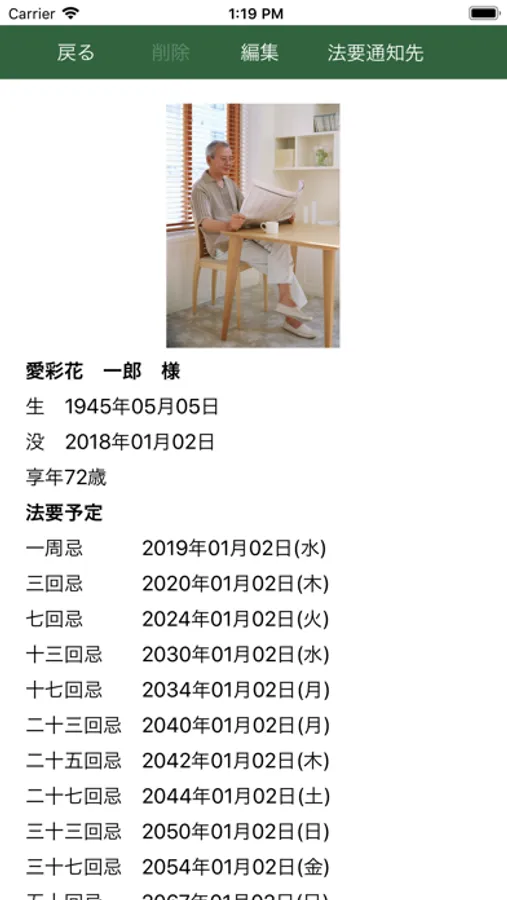 登録されている故人様の写真、誕生日、命日、法要の予定などを確認できます。