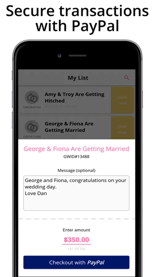 Furthermore people can give in the app to your Wedding today, and the funds do not come from their PayPal account until the day of the wedding. The amounts are automatically placed directly into your PayPal, there is no middlemen or waiting for transfers. Gifts never come through our account, only direct to yours.