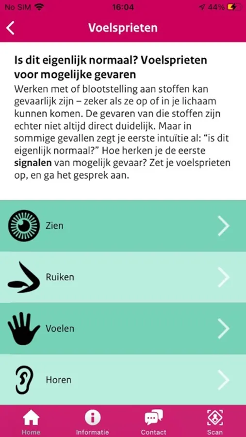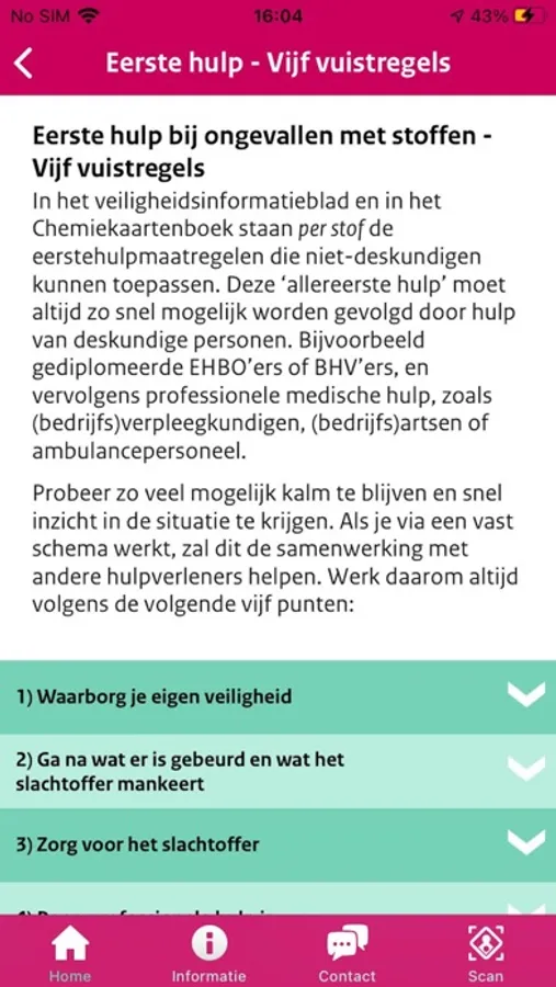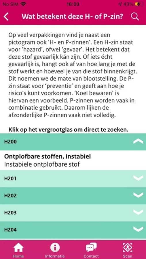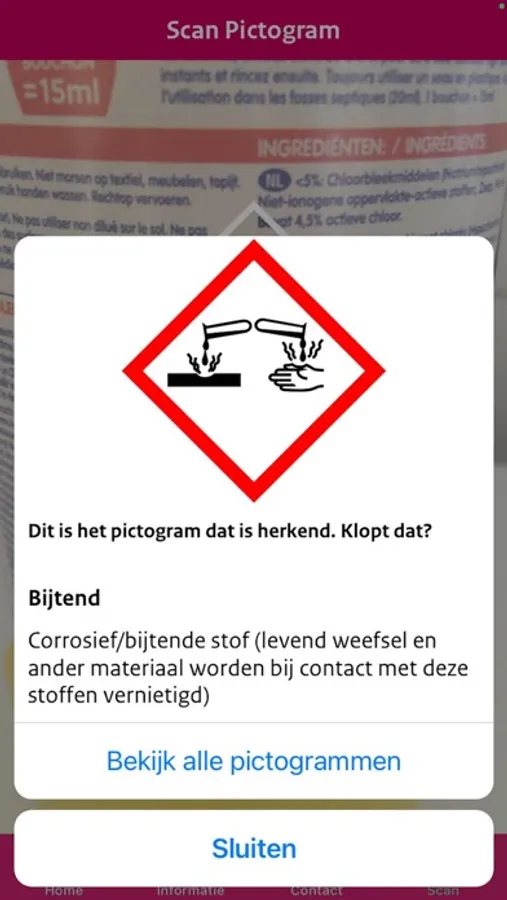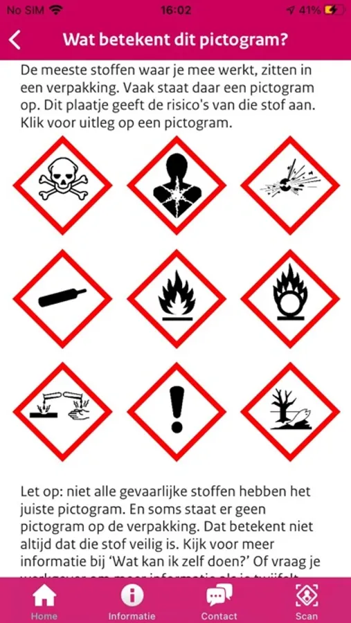 Er wordt toelichting gegeven bij de pictogrammen die vaak op verpakkingen staan. Ook wordt uitgelegd wat H- en P-zinnen betekenen, wat de grenswaarden van stoffen zijn, welke twaalf stoffen het gevaarlijkst zijn, welke vijf vuistregels gelden voor eerste hulp bij ongevallen met gevaarlijke stoffen, hoe je gevaren kunt herkennen en wat je zelf kunt doen om de risico’s te beperken. De scanfunctie maakt het mogelijk om de pictogrammen op verpakkingen te scannen.