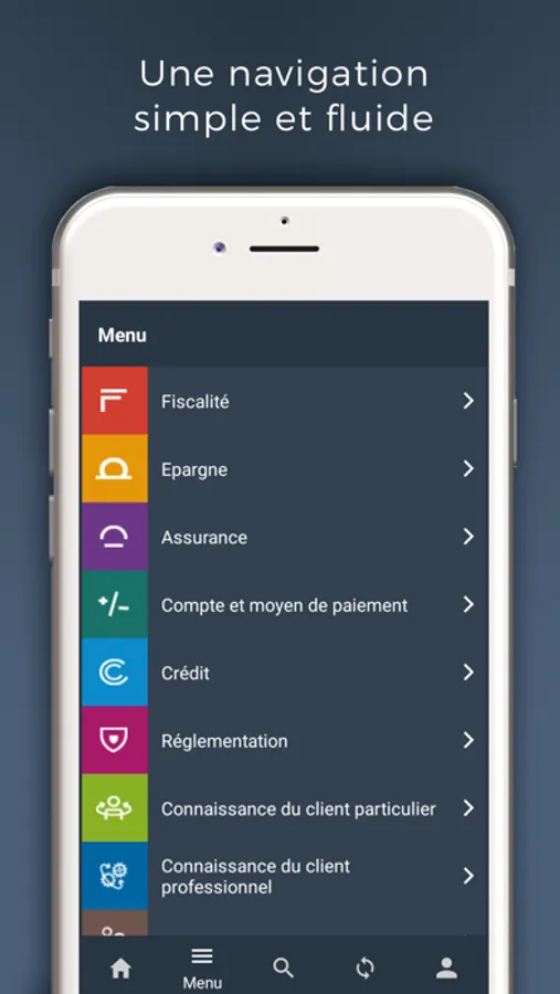 - Une navigation simple et intuitive vous donne accès aux domaines d’activité qui vous concernent : fiscalité, épargne, assurance, compte et moyen de paiement, crédit, règlementation, connaissance du client particulier, connaissance du client professionnel, gestion de la relation commerciale…,