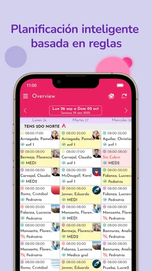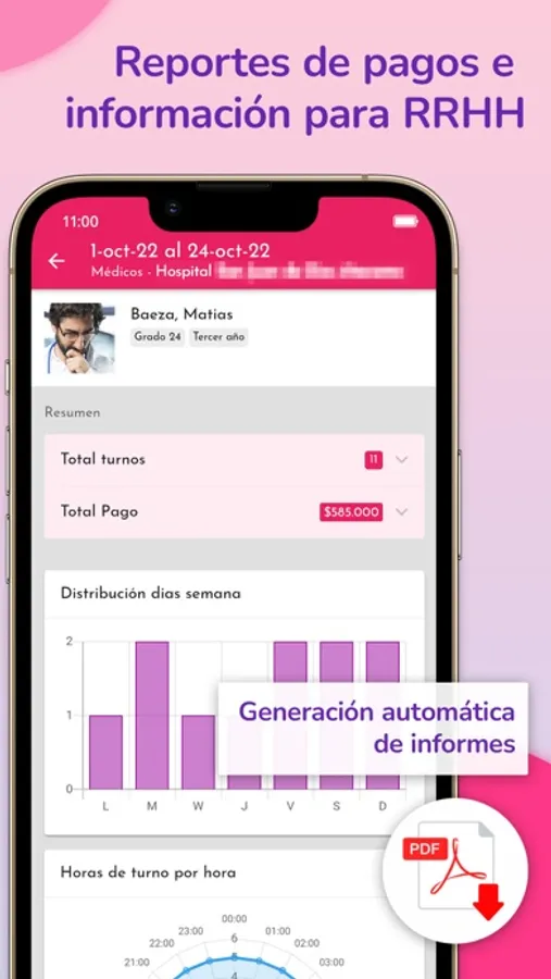 El administrador puede diseñar un esquema y planificación de turnos, reutilizando plantillas. Incluye además reportes mensuales de tipos de turno, horarios, días de la semana, y pagos asociados.