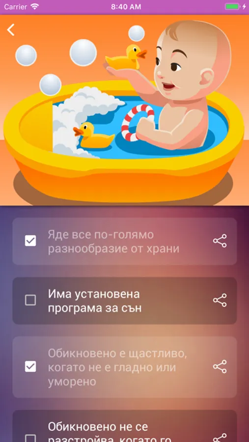 Приложение FEIA Детско развитие не замества редовните визити при педиатъра на детето. Не се притеснявайте ако то не извършва някое от описаните в приложението действия. Важна е общата тенденция в развитието му. Ако детето не е усвоило описаните умения или имате притеснения, че не усвоява част от тях, консултирайте се с педиатър.
