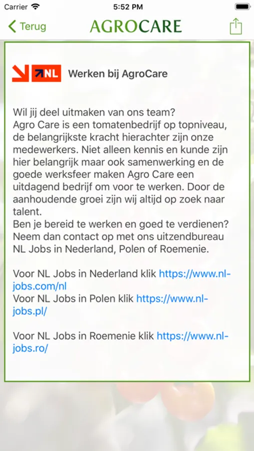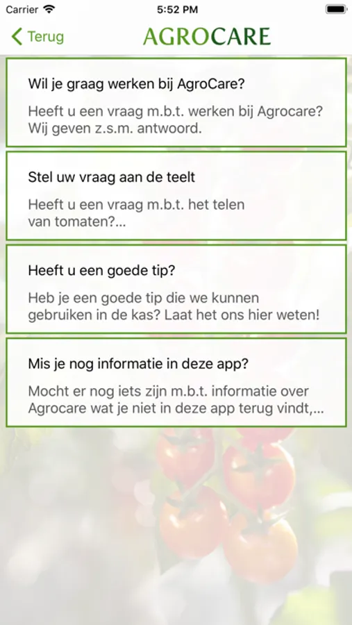 De app over AgroCare geeft info over alles wat je moet weten als je gaat werken bij AgroCare. Er kunnen verschillende talen gekozen worden. Er wordt uitleg gegeven over de verschillende werkzaamheden bij AgroCare. Plattegronden van de verschillende kassen kun je vinden. Op de meest gestelde vragen wordt antwoord gegeven. En regelmatig verschijnt er nieuws en aankondigingen in deze app.