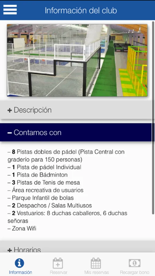 – 2 Vestuarios: 8 duchas caballeros, 6 duchas señoras
