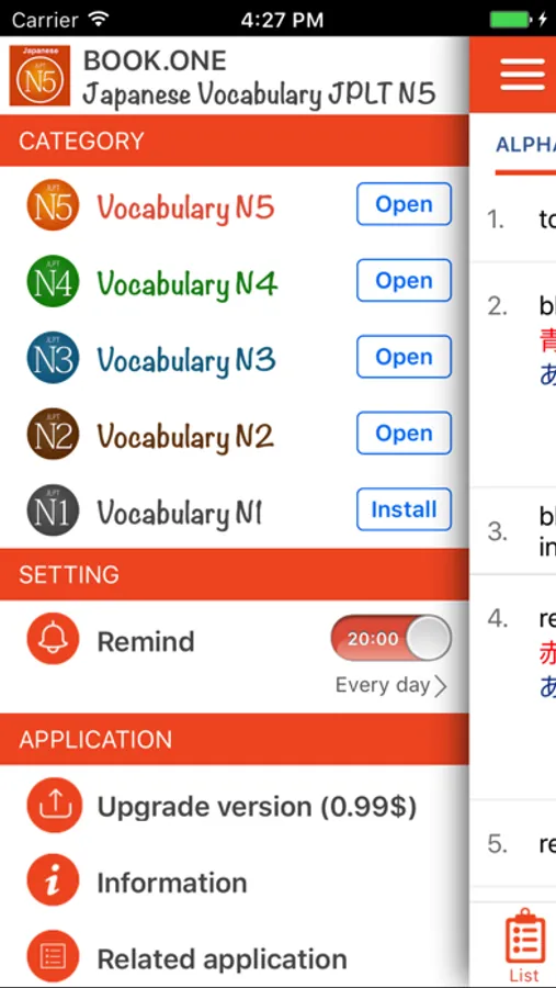 . ••• Japanese Vocabulary (JPLT N5) is a helpful tool to learn the Japanese language and prepare for the exam by studying Japanese vocabulary. It contains a list of over 1.000 words across be interpreted clearly will help you become fluent in Japanese. Understand the basic concepts of Japanese words will help you learn Japanese easily. This app is an free offline application to help you learn Japanese vocabulary with a simple and efficient way. •••