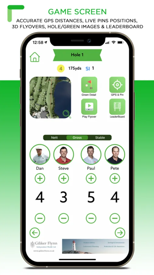 Multiplayer Scoring, Accurate GPS Distances, High Quality 3D Flyovers, Pin Positions and Detailed Hole & Green images on golf courses across Europe.
