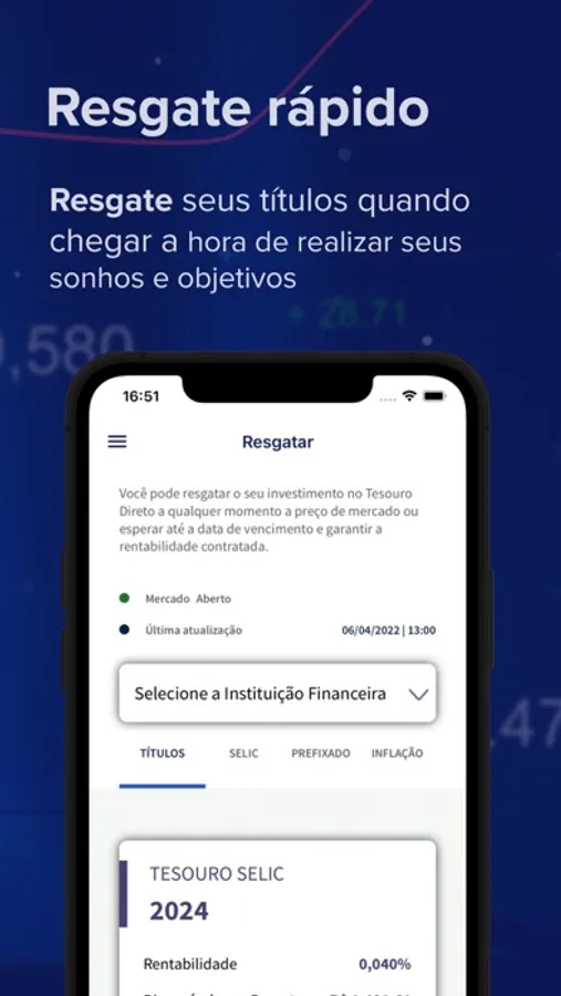 - Investir: para investir consulte as taxas de rendimento dos títulos e adicione-os ao carrinho de investimento. Você pode investir hoje ou realizar agendamentos, programando melhor sua vida financeira.
