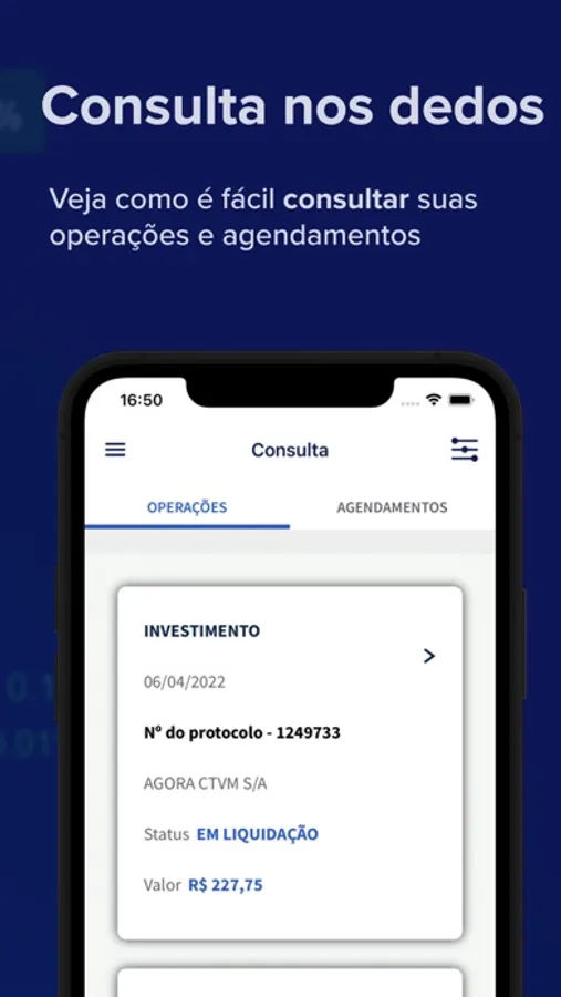 - Consultas: busque suas informações de investimentos, resgates e reinvestimentos realizados ou mesmo dos seus agendamentos.