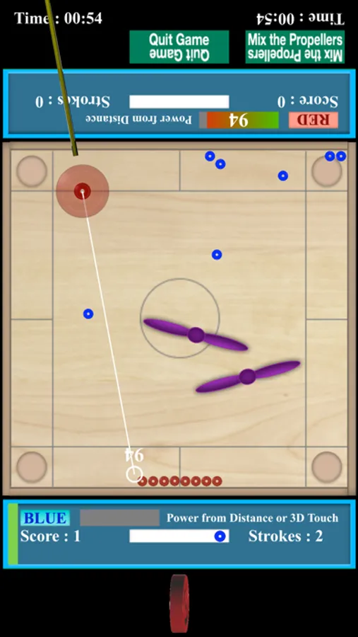 Players use a cue stick and a striker from their own edge zone line to strike the pucks.
