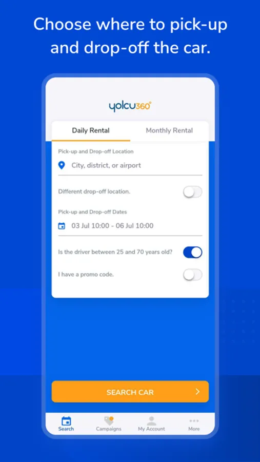 • Always check the campaign tab on Yolcu360 Car Rental App or yolcu360.com website to rent a car with discounted prices.