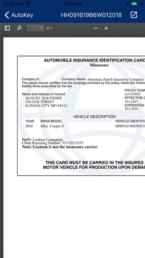 Lockton AutoKey allows the retrieval of an active Auto ID card by providing a valid VIN.